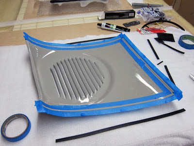 I was too stressed out to take photos while I was gluing the weatherstrip in the front door, but with that out of the way, I did take a few photos of gluing the weatherstrip in the engine panel. The 3M weatherstrip adhesive can be a little messy. I taped off the area around where the weatherstrip is is going to be installed.