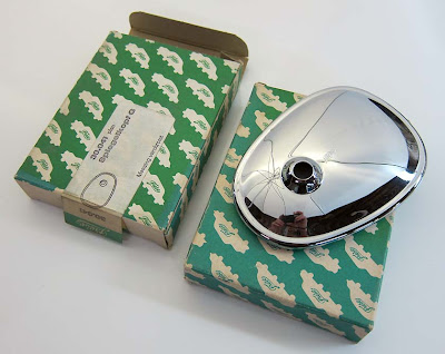 The original Albert mirror head on my side mirror was pretty messed up. It had been crudely pried open to replace the glass, so it was deformed and had plier marks all around the edge. I really wanted to use the original Albert mirror and spent quite a bit of time trying to rescue it, but in the end I decided to find a replacement. Now I see quite a few Bumm reproductions of the Albert mirrors on ebay, but it seems they weren't around a few years ago when I was looking for a replacement. I ended up using a period correct NOS German made Frese mirror.